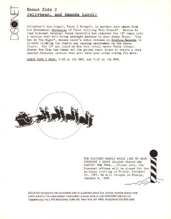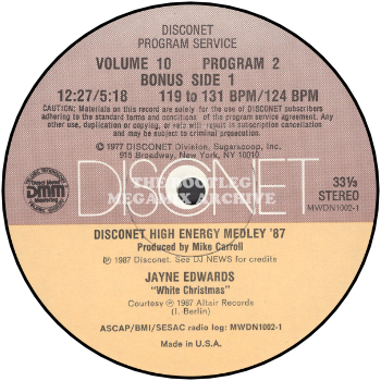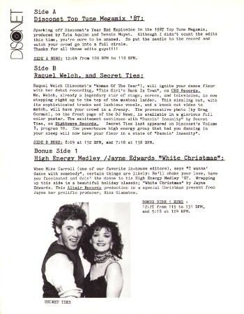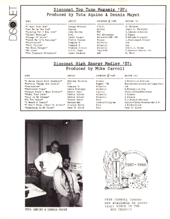 Sparking off Disconet's Year End Explosion is the 1987 Top Tune Megamix, produced by Tuta Aquino and Dennis Muyet. Although I didn't count the edits this time, you're sure to be amazed. So put the needle to the record and watch your crowd go into a full circle. Thanks for all those edits guys!!!!