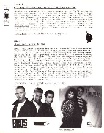 Sparking off Disconet's July program celebration is "The Whitney Houston Medley". This Megamix of Whitney's hottest dance tunes ("I Wanna To Dance With Somebody", "How Will I Know", "So Emotional", and "Love Will Save The Day") was produced by Disconet's Golden Razor Blade, Mike Carroll. From start to finish this captivating Megamix is a non-stop explosion of firecracker edits, exploding breaks, and crowd pleasing screamers. The excitement continues with "Forbidden Lover" by 1st. Impression, on Arista Records. Ned Bannan and Chris Walsh of KISS FM Hartford Ct., have teamed up to create a special Disconet version of this exciting floor packing, percussive dance tune.