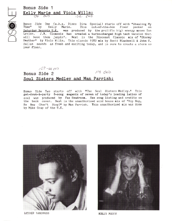 Bonus Side Two starts off with "The Soul Sisters Medley." This get-down-&-party 8-song megamix of seven of today's leading ladies of soul was produced by Fax Headroom.