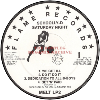 SCHOOLLY-D ‘B-Boy Rhyme & Riddle’ (LP ‘Saturday Night! The Album’ Flame Records MELT LP-2)