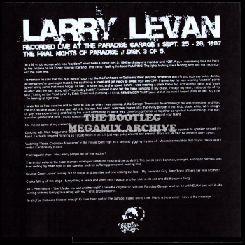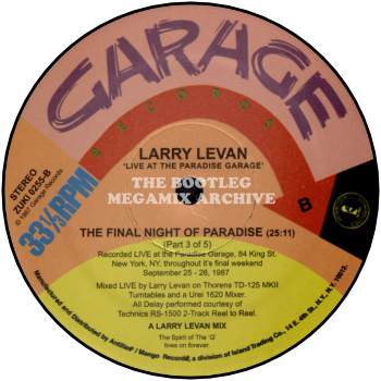 COMMENTS: According to the label, this was recorded live at The Paradise Garage throughout its final weekend of September 25-28, 1987. It was mixed live by Larry Levan on Thorens TD-125 MKII Turntables and a Urei 1620 Mixer. All delays were performed courtesy of a Technics RS-1500 2-Track reel to reel.
