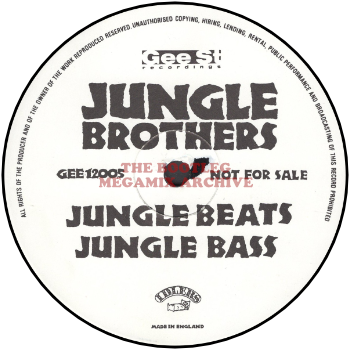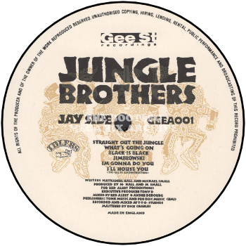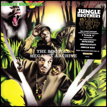 Gee St Recordings’ UK version of the Jungle Brothers’ ‘Straight Out The Jungle’ (GEEA001) adds to the album’s originally reviewed tracks the Richie Rich reconstructed ‘I’ll House You’ hit, plus, with the first 5,000, a bonus 12 inch containing a ‘Because I Got It Like That’ (and thus also Sly Stone) based 0-108-107⅚bpm Ultimatum’s Ultramix, flipped by its chuggingly drummed 107⅚bpm Jungle Beats and brief Jungle Bass