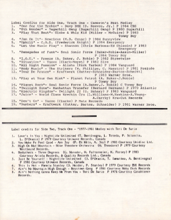 Davy D.M.X. - One For The Treble (Fresh) (1984); Sugarhill Gang - 8th Wonder (1980); G.L.O.B.E. & Whiz Kid - Play That Beat Mr. D.J. (1983); Newcleus - Jam On It (1984); C.O.D. - Uphill (Peace Of Mind) (1984); Afrika Bambaataa & The Soul Sonic Force - Looking For The Perfect Beat (1983); Shannon - Let The Music Play (1983); Freeez - I.O.U. (1982); Yazoo - Situation (1982); Alisha - All Night Passion (1984); Strikers - Body Music (1980); Kraftwerk - Tour De France (1983); Planet Patrol - Play At Your Own Risk (1982); Afrika Bambaataa & The Soul Sonic Force - Planet Rock (1982); Manhattan Transfer - Twilight Zone (1980); Twilight 22 - Electric Kingdom (1983); World Class Wreckin' Cru - Juice (1985); Yazoo - Don't Go (1982); Kraftwerk - Numbers (1981)
