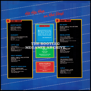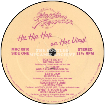 Egyptian Lover - Egypt, Egypt (1984); World Class Wreckin' Cru - Surgery (1984); Unknown D.J. - Let's Jam (1985); L.A. Dream Team - Rock Berry Jam (1985); Uncle Jamm's Army - What's Your Sign (1985); Uncle Jamm's Army featuring Mr. Prince & Miss Nysa - Naughty Boy (1985)