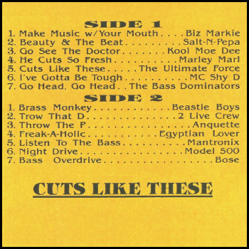 Marley Marl featuring M.C. Shan - He Cuts So Fresh (1986); Boogie Boys - Run It (1986); Beastie Boys - Paul Revere (1986); Beastie Boys - Hold It, Now Hit It (1986); Billy Squier - The Big Beat (1980); Run-D.M.C. - Peter Piper (1986); Eazy-E & Ron-De-Vu - L.A. Is The Place (1987); Eric B. & Rakim - Eric B. Is President (1986); Ice-T - Dog'n The Wax (Ya Don't Quit-Part II) (1986); Whistle - (Nothing Serious) Just Buggin' (1985); Salt-N-Pepa - Part II At Warp Speed (1986); Dana Dane - Nightmares (1985); Tom Tom Club - Genius Of Love (1981); Run-D.M.C. - My Adidas (1986); Beastie Boys - It's The New Style (1986); U.T.F.O. - Split Personality (1986); D.J. Jazzy Jeff & The Fresh Prince - Girls Ain't Nothing But Trouble (1986)
