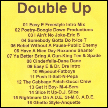 Eazy-E Freestyle; Boogie Down Productions - Criminal Minded (1987); Davy D. - Have You Seen Davy (1987); Eric B. & Rakim - Chinese Arithmetic (1987); Eric B. & Rakim - I Ain't No Joke (1987); Ice-T - 6 In The Mornin' (1986); King Tee & Mixmaster Spade with The Compton Posse - Ya Better Bring A Gun (1987); Eric B. & Rakim - Eric B. Is President (1986); King Tee - The Coolest (1987); Dana Dane - Cinderfella Dana Dane (1987); Eazy-E - The Boyz-N-The Hood (1987); N.W.A. - 8-Ball (1987); Roxanne Shante - Have A Nice Day (1987); World Class Wreckin' Cru - Cabbage Patch (1987); Dimples D. - Sucker D.J.'s (I Will Survive) (1983)