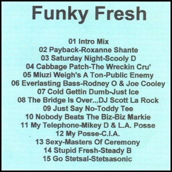 Kool Moe Dee - Go See The Doctor (1986); D.J. Jazzy Jeff & The Fresh Prince - The Magnificent Jazzy Jeff (1987); Schoolly-D - Gucci Time (1985); Salt-N-Pepa - My Mike Sounds Nice (1986); Joeski Love - Pee-Wee's Dance (1986); Roxanne Shante - Pay Back (1987); Roxanne Shante - Freestyle Live (1987); Toddy Tee featuring Mix Master Spade - Just Say No (1986); Schoolly-D - Saturday Night (1986); Ice-T - Dog'n The Wax (Ya Don't Quit-Part II) (1986); Eric B. & Rakim - Eric B. Is President (1986); Biz Markie featuring T.J. Swan - Nobody Beats The Biz (1987); Biz Markie featuring T.J. Swan - Make The Music With Your Mouth Biz (1986); Ice-T - 6 In The Mornin' (1986); Captain Rock - Cosmic Blast (1984); Just-Ice - Cold Gettin' Dumb (1986); Heavy D. & The Boyz - Mr. Big Stuff (1986); Whodini - One Love (1986)