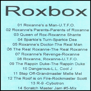 Ralph Rolle - Roxanne's A Man (The Untold Story) (1985); Gigolo Tony & Lacey Lace - The Parents Of Roxanne (1985); Roxanne Shante - Queen Of Rox (Shante Rox On) (1985); Sparky-D - Sparky's Turn (Roxanne You're Through) (1985); Dr. Freshh - Roxanne's Doctor-The Real Man (1985); The Real Roxanne with U.T.F.O. - The Real Roxanne (1985); Roxanne Shante - Roxanne's Revenge (1984); U.T.F.O. - Roxanne, Roxanne (1984)