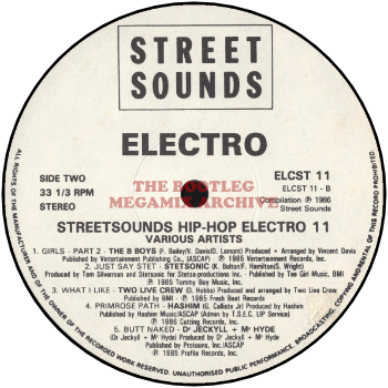 B Boys - Girls-Part 2 (1985); Stetsasonic - Just Say Stet (1985); 2 Live Crew - What I Like (1985); Hashim - Primrose Path (1986); Dr. Jeckyll & Mr. Hyde - Butt Naked (1985)