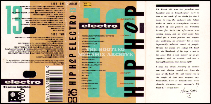 Grandmaster Flash - Style (Peter Gunn Theme) (1986); Afrika Bambaataa & Family - Bambaataa's Theme (Assault On Precinct 13) (1986); Hashim featuring M.C. Devon - UK Fresh '86 (The Anthem) (1986); Dr. Jeckyll & Mr. Hyde - Fast Life (1984); Aleem featuring Leroy Burgess - Get Loose (1984); Masquerade - (Solution To) The Problem (1986); Sir Mix-A-Lot - Square Dance Rap (1986); Captain Rock - The Return Of Capt. Rock (1983); Information Society - Running (1984); World Class Wreckin' Cru - Mission Possible (1986)