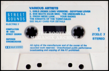 Egyptian Lover - Girls (1984); Unknown D.J. - 808 Beats (Eight Hundred And Eight Beats) (1984); Knights Of The Turntables - Fresh Mess (Jam...Your Radio) (1985)