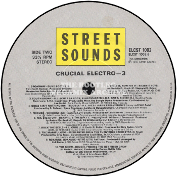 Full Force - Alice, I Want You Just For Me (1985); Original Concept - Can You Feel It? (1986); Whistle - (Nothing Serious) Just Buggin' (1985); Mantronix - Bassline (1985); Roxanne Shante - Bite This (1985); Grandmixer D. St. - Megamix II: Why Is It Fresh? (1984); Chris 'The Glove' Taylor, Dave Storrs, Karlos Z. & Victor Flores - Itchiban Scratch (1985); Newcleus - Jam On Revenge (The Wikki-Wikki Song) (1983); Information Society - Running (1984); Unknown D.J. - 808 Beats (Eight Hundred And Eight Beats) (1984)