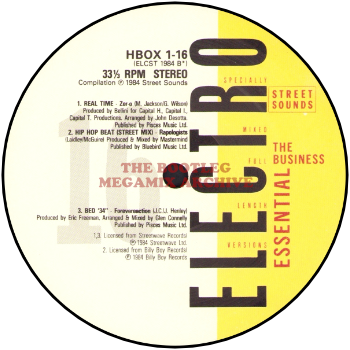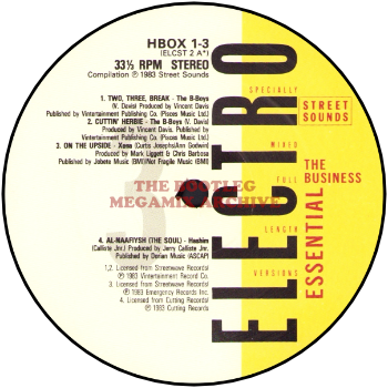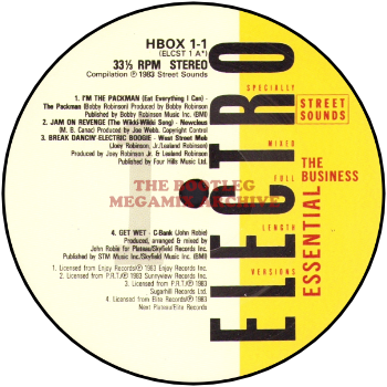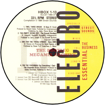 B Boys - Two, Three, Break (1983); Russell Brothers - The Party Scene (1983); Davy D.M.X. - One For The Treble (Fresh) (1984); Packman - I'm The Packman (Eat Everything I Can) (1983)