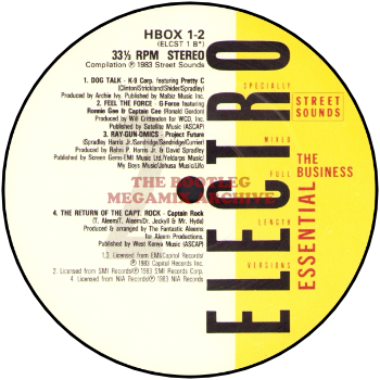 K-9 Corp featuring Pretty C - Dog Talk (1983); G-Force featuring Ronnie Gee & Captain Gee - Feel The Force (1983); Project Future - Ray-Gun-Omics (1983); Captain Rock - The Return Of Capt. Rock (1983)