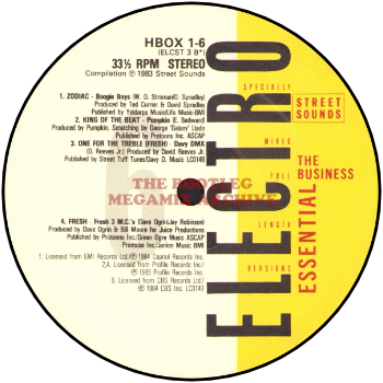 Boogie Boys - Zodiac (1984); Pumpkin - King Of The Beat (1983); Davy D.M.X. - One For The Treble (Fresh) (1984); Fresh 3 M.C.'s - Fresh (1983)