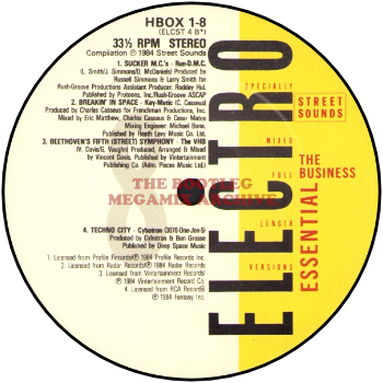 Run-D.M.C. - Sucker M.C.'s (Krush-Groove 1) (1983); Key-Matic - Breakin' In Space (1984); V.H.B. - Beethoven's Fifth (Street) Symphony (1984); Cybotron - Techno City (1984)