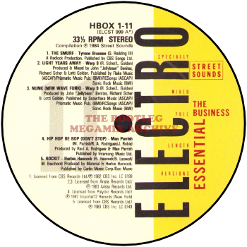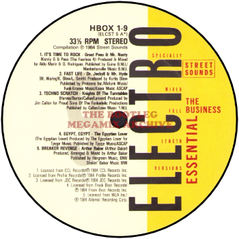 Great Peso & Mr. Nasty - It's Time To Rock (1984); Dr. Jeckyll & Mr. Hyde - Fast Life (1984); Knights Of The Turntables - Techno Scratch (1984); Egyptian Lover - Egypt, Egypt (1984); Arthur Baker - Breaker's Revenge (1984)