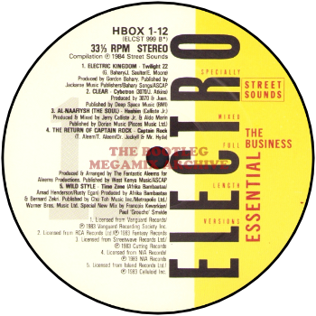 Twilight 22 - Electric Kingdom (1983); Cybotron - Clear (1983); Hashim - Al-Naafiysh (The Soul) (1983); Captain Rock - The Return Of Capt. Rock (1983); Time Zone - The Wildstyle (1983)