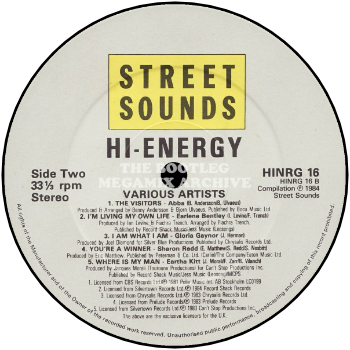 Ian Levine, slipping back into his old shape, has mixed Miquel Brown ‘Men’/Kofi/Laura Pallas/Simone/Shirley Lewis/Abba ‘The Visitors’/Earlene Bentley ‘Life’/Gloria Gaynor/Sharon Redd ‘Winner’/Eartha Kitt for ‘Street Sounds Hi-Energy 1‘ (HINGR 16), due now