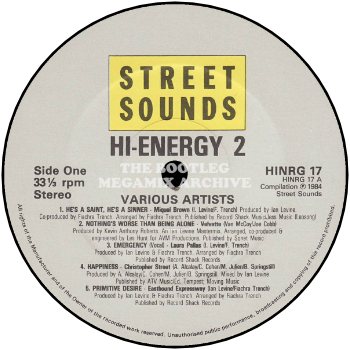 Miquel Brown - He's A Saint, He's A Sinner (1983); Velvette - Nothing Worse Than Being Alone (1984); Laura Pallas - Emergency (1984); Christopher Street - Happiness (1984); Eastbound Expressway - Primitive Desire (1983)