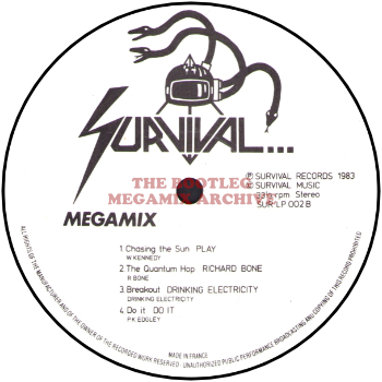 The ‘Megamix’ side of this strictly futurist electro set is a neatly segued medley of Play’s 140bpm ‘Chasing The Sun‘, Richard Bone’s 131bpm ‘The Quantum Hop‘, Drinking Electricity’s 138bpm ‘Breakout‘ and Do It’s 129bpm ‘Do It’ — Bone’s Yazoo-ish contribution, with some of those ‘Buffalo Gals’ clucking effects, evidently has been much used by “break” dancers in the Bronx and certainly sounds useful now.