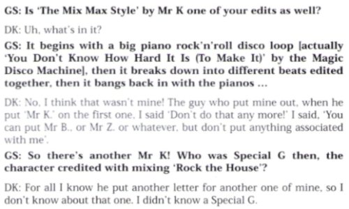 COMMENTS: Despite the label showing 'Mr. K. Mix' which is the usual credit for Danny Krivit, the below comment by him in an article from Grand Slam Magazine indicates that he didn't do this mix. I will keep it as part of his discography however because it is credited to him on the label...