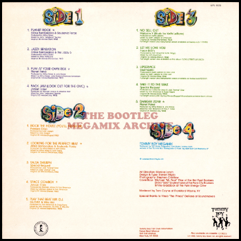 On double LP all the label’s hits from ‘Jazzy Sensation’, ‘Planet Rock’, ‘Play At Your Own Risk’, ‘Pack Jam’, ‘Rock The House’, ‘Looking For The Perfect Beat’, ‘Salsa Smurph’, ‘Space Cowboy’, ‘Play That Beat Mr DJ’ to ‘No Sell Out’, ‘Let Me Love You’, ‘Lipservice’, ‘Take It To The Max’ and ‘Danger Zone’, with as the fourth side a very clean 114-116-119-125-127bpm ‘Tommy Boy Megamix’ by contest winners 3-D (Ralph D’Agostino, Tom Musto, Tommy Sozzi), the main attraction for anyone already owning the (longer) 12in originals.