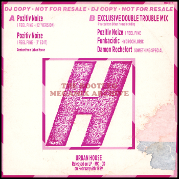 Shrill girls chanted twittering 124⅕-0bpm jittery chugger, not the Beatles song (124-0bpm 7” Edit too), coupled on so-called promo copies, in a bid to publicise their parent ‘Urban House‘ album (actually the now terminally dated ‘Urban Acid Volume 2’ with a rapid name change!), by a 123½-123¾-123½bpm Double Trouble mix of the Sharon Dee Clarke souled but Damon Rochefort credited ‘Something Special‘, aforementioned ‘I Feel Fine’, stuttery acidic Freeland & Morrison ‘Where’s The Party‘, and more purple/P’funky Funkacidic ‘Hydrochloric’ – this latter megamix being replaced on commercial pressings (Urban URBX 30) by Pozitiv Noize’s older datedly “acieed” 123⅕bpm ‘Africa’ from the first ‘Urban Acid’ compilation.