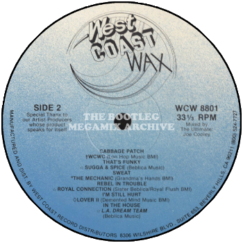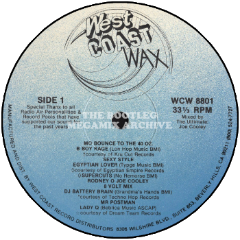 B-Boy Rage & The Bedroc Posse - Mo Bounce To The 40 Oz. (1988); Egyptian Lover - Sexy Style (Sexy Ain't It?) (1987); Rodney-O & Joe Cooley - Supercuts (Yeah Boy) (1988); D.J. Battery Brain - 8 Volt Mix (1988); Ms. Lady Q - Mr. Postman (1988)